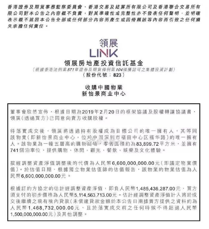 2月20日晚间,据亚洲最大房地产信托投资基金(领展),在港交所发布公告称: