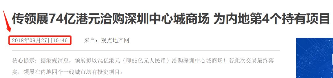 其实早在去年8月已经传出消息称,领展拟斥资约74亿港元(即65亿元人民币)购买深圳中心城商场。据观点地产新媒体证实,此前提到的深圳中心城和领展本次收购的新怡景商业中心为同一个项目。