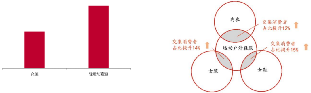 而中国轻运动消费者人数近2亿,轻运动赛道服饰GMV增速是女装品类的1.7倍,运动服饰和日常服饰的融合度明显增强,天猫运动户外鞋服与女装/女鞋/内衣的交集消费者占比提升了14%/15%/12%,瑜伽服、紧身裤这类轻运动代表产品占比最高,消费、增长潜力巨大。