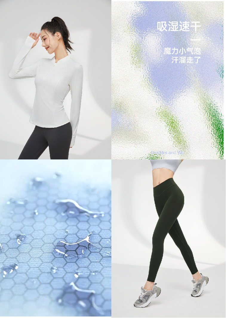 基于国人的体型数据、运动、消费习惯以及审美,在深度了解亚洲女性身体数据的基础上,将多功能纱线、相变材料、功能性微胶囊以及纳米整理等技术应用其上,打造出更贴合亚洲女性身型的科技面料运动产品。