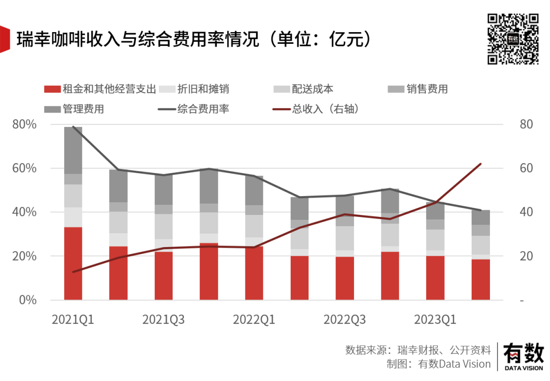 想要一杯咖啡卖个位数还能有利润,首先需要足够大的规模效应。从收入端来看,瑞幸今年二季度总营收为62.01亿元,同比增长88%,继续保持着高速增长的态势。与此同时,尽管本季度瑞幸推出9.9元的活动,不但没有对经营利润造成影响,反而使得盈利能力进一步提高,二季度实现经营利润为11.72亿元,经营利润率为18.9%,为历史最高。经营利润率的提高是由规模效应所贡献的,其规模分为两方面:门店数量和销售杯量。从门店数量来看,瑞幸一季度相比今年一季度新开1485家,等于每一个半小时就有一家全新的瑞幸开业,相比一季度每两小时开一家,速度进一步提高。拆分来看,直营门店的增长也大于联营门店,两者分别新增878家与607家。门店作为触达客户最有效的手段,各大品牌都想增加门店密度,但门店扩张又是一把双刃剑。一方面,门店数量增长会带来覆盖用户数的增加,但另一方面,门店密度过高又会导致分流,使得原有门店交易用户数下降。在餐饮界,如何控制门店密度一直是一个技术难度超高的“玄学”问题。作为“火锅一哥”海底捞就曾在这个问题上翻车,2020年疫情下门店租金下降,海底捞逆势抄底,在成熟商圈大肆开店,最终却以“啄木鸟计划”关店收尾。但瑞幸似乎没有这个问题。今年二季度,瑞幸月均交易客户数达到4307万人,同比增长108%,平均到每家门店上,则是单店月均交易客户数为3975人,同比增长38%。这背后的原因有三点。首先是智能选址与精细运营同步进行。经过长时间的积累,瑞幸的大数据选址已经成熟,这极大的提升门店拓展的效率,叠加上市场更为集中的高线城市直营深耕,分散的低线城市联营,实现扩张最大化,影响最小化。其次是爆款推动,本季度瑞幸推出冰吸生椰拿铁,首周突破666万杯,相比之前与椰树联名推出的椰云拿铁单周495万杯,销量再上一个台阶。最后,瑞幸本季度推出9.9元的活动,极大的降低了喝瑞幸咖啡的门槛,使得用户基础进一步扩大。规模效应最终体现在财报上,则是收入规模不断扩大,由门店租金以及折旧摊销等组成的综合费用率不断下降。也就是说,瑞幸能把咖啡卖到个位数,实际上是用规模堆出来的。