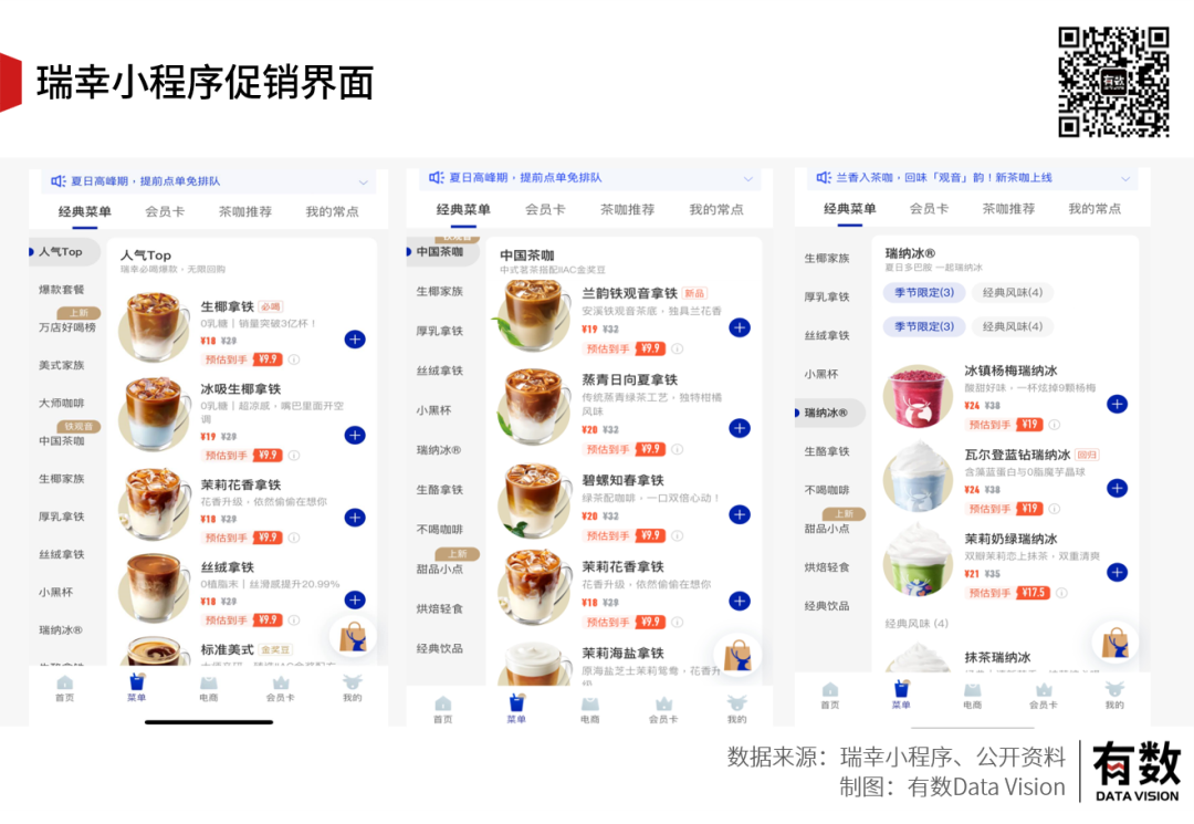 常理而言,品牌商让利一定程度会降低品牌商盈利能力,但事实上,瑞幸成为了唯一的受益者。这得益于瑞幸巧妙的将活动范围做了两个限定。第一:每周每账号只能买一杯,第二:参与活动的饮品做了限制,主要是经典咖啡、奶咖系列等,而不包含瑞幸的高端线SOE小黑杯系列,瑞纳冰等非咖啡因类饮品。这不仅巧妙的规避了无休止价格战所带来的利润影响,还成功培养了下沉市场的咖啡消费习惯。对于当下三四线城市而言,咖啡门店走在了咖啡消费习惯的前面。据艾瑞消费研究员调查,49%的小镇青年的家乡已经有了咖啡馆,但只有不到4%的人会经常去咖啡馆消费。原因也很简单,3000的月薪无法与均价30元的咖啡相匹配。而瑞幸每周那杯9.9元的咖啡,可以让他们无痛感受一线白领的生活。其次,咖啡具有很强的依赖性。从券商研究数据看,随着喝咖啡的时间变长,每周只喝1到2杯的占比越来越低,而每天一杯以及每天两杯的比例越来越高。随着时间的流逝,下沉市场的咖啡消费习惯逐渐养成,而瑞幸作为他们咖啡路上的领路人,自然会成为其优先选择项。除了培育更多的潜在客户以外,瑞幸在口味上的创新早已打破咖啡与奶茶之间的壁垒,而更大的优惠力度将持续渗透奶茶的用户圈。截止2022年底在业的新茶饮门店总数约48.6万家,是咖啡门店数量的两倍多,背后反映的是奶茶需求远大于咖啡需求。除了口味偏甜之外,奶茶亲民的价格也是主要因素。便宜的奶茶六七块钱就能喝一杯,贵的也差不多三十左右。但相比较咖啡的价格就比较贵了,便宜的也基本十几二十起,但贵的却上不封顶。而瑞幸的奶咖口味本就偏甜,搭配上低于当前大多数奶茶品牌均价,商业破圈便成了自然而然的事。除了商业破圈之外,瑞幸这一招还能进一步蚕食竞争对手的市场份额。在商业竞争层面,头部品牌的优惠策略对于盈利能力更弱的同行打击异常致命,最典型的例子是年初的车企降价潮。年初新能源车首次全面退补,拮据的车企原本还想着通过涨价来对冲退补对利润的吞噬,没想到特斯拉不讲武德,国产Model 3的起售价直接降到22.99万元,抢走了更多的市场份额。此时车企为了保住自身的市场份额,市场整体迎来了一波降价潮,而这进一步加剧了车企的亏损幅度,传导到现在,新势力中的蔚来和小鹏都只能再次向市场融资。如今消费市场热潮已过,沪上阿姨等奶茶品牌迫不及待排队上市期望从二级市场拿到下一轮输血,咖啡新品牌们如果需要长期面对低价竞争和亏损,投资人和加盟商多少会有些胆寒。另一方面,在人们消费欲望衰退的今天,一杯9.9的咖啡,也挺好。[3]中国现磨咖啡龙头,破茧成蝶振翅高翔,第一上海证券[4]加盟商陪瑞幸、库迪肉搏:贴身战、规模战和价格战,连线Insight[5]返乡年轻人挤爆咖啡店!2022年我国咖啡相关新增企业同比增长37%,企查查财经