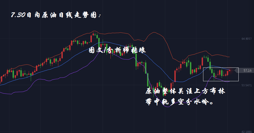 原油日内技术分析:昨日盘中原油整体走势与分析师张琅预期一致,盘中反弹上探至56.8美元压力后快速回撤走弱至55.8美元支撑,凌晨原油整体再次出现技术面反弹上攻至57美元压力附近。今日早盘原油整体再次走高上探布林带中轨压力附近,日线布林带整体延续持平运行,日内原油重点关注布林带中轨压力的破位情况,目前布林带中轨可视为原油的多空分水岭。因此日内后市操作上分析师张琅建议关注上方57.4-57..7美元压力区间,可视为空单机会。若原油下破56.5美元支撑,则顺势追空即可。