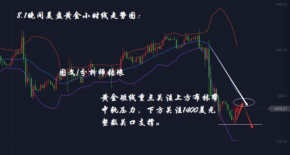 黄金日内技术分析:黄金日内盘中与分析师张琅预期一致,早盘出现技术面调整反弹走高1410美元后,午后欧盘金价整体延续空头走势成功刷新日内低点至1402美元附近。目前黄金整体处于1400—1410美元窄幅区间震荡运行。小时线布林带整体初步出现低位缩口的趋势,黄金整体存在技术面反弹走高上探布林带中轨压力后,再次回撤走弱下探1400美元支撑的趋势,若整体保持弱势金价有望对1400美元破位,延续下行至布林带下轨支撑附近。因此分析师张琅建议晚间美盘操作上,关注上方小时线布林带中轨1410-1414美元区间压力,可视为空单机会;下方重点关注1400美元多空分水岭,破位追空,不破进多。