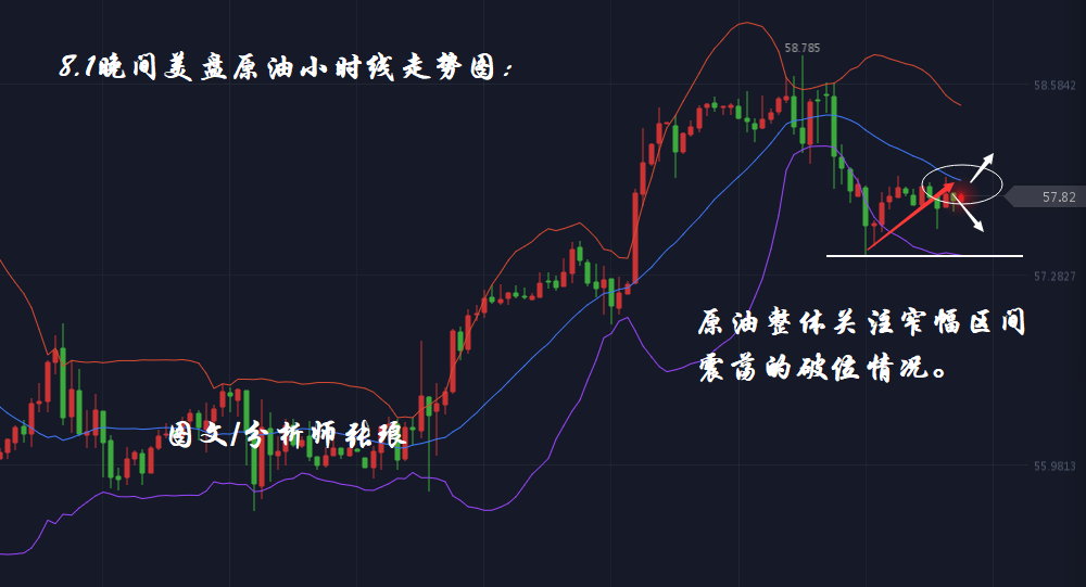 原油日内技术分析:原油日内盘中与分析师张琅预期一致,日内盘中整体仍坚守57.5美元支撑位。日内原油整体于57.6-57.9美元区间窄幅震荡运行。目前小时线布林带整体小幅下行,油价上探至布林带中轨压力57.9美元后出现回撤。整体来看,原油晚间美盘预期将再次上攻布林带中轨压力之后,出现回撤调整走势,后市原油整体有下破前期低位57.4美元趋势。若油价下破57.4美元,后市有望延续走弱,反之原油有望重回多头趋势。因此分析师张琅建议晚间美盘操作上,上方关注布林带中轨58.0-58.3美元区间压力可视为空单机会;下方57.4美元支撑,可视为多单机会。