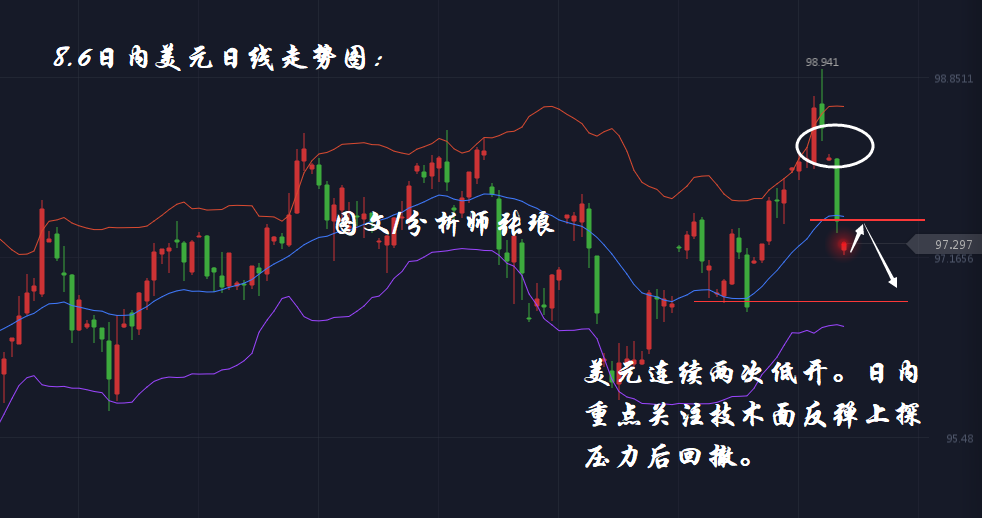 美元在上周四上探历史高位至98.9后,至今日已经出现两次大幅低开的情况,在昨日美元成功走弱下探至日线布林带中轨之后,今日早盘美元再次出现大幅低开的情况,美元有望进一步承压走弱。下一步美元重点关注96.7前期低位支撑。预期今日盘中美元整体将出现技术面反弹回补低开遗留下的缺口,上探至昨日低位及布林带中轨压力后,再次出现回撤走弱的情况。不论基本面如何变化,我们只需要熟悉基本面,集合技术面所释放的趋势信号,便可把握市场风向。希望长期关注的朋友能够在市场之中做到边投资、边学习。而最终的目标是帮助朋友们建立起一套完善的操作计划,拥有独立操作的能力。