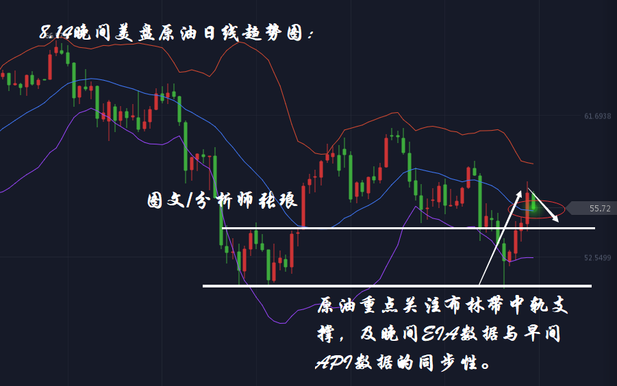 今日盘中原油整体走势回撤走弱,下破56美元关口,与预期一致油价有延续走弱下探日线布林带中轨支撑的趋势。原油日线整体来看,布林带整体持平运行,油价整体有下探至日线布林带中轨55.5美元支撑的趋势。考虑到今日晚间EIA原油库存数据的影响,重点关注55.5美元支撑的破位情况,技术面55.5可视为多空分水岭。由于API数据意外利空,从API数据与EIA数据的同步性而言,今日晚间EIA数据大概率将是一个利空的表现。因此晚间美盘上方重点关注56.0-56.4美元压力区间,下方关注布林带中轨55.5美元支撑即可,若油价下破55.6则顺势追空。不论EIA数据公布结果如何,保持逢高看空策略为主,低位看多为辅。
