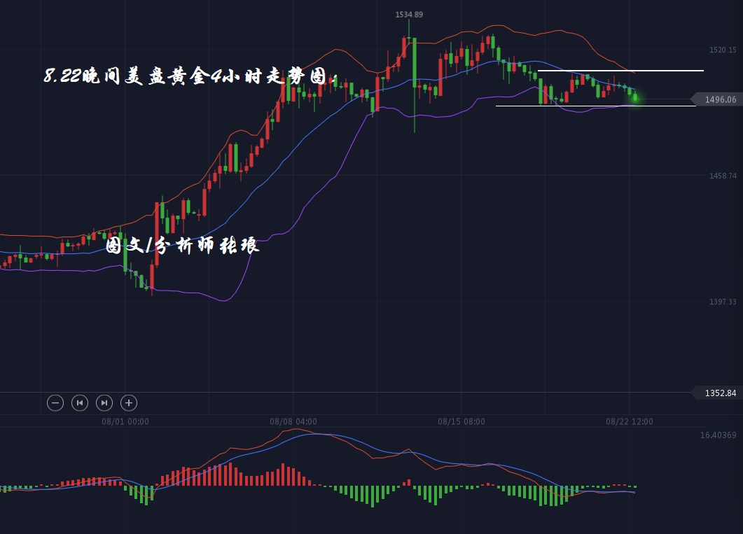 技术面4小时走势图:布林带整体再度出现缩口运行趋势,金价日内持续受到布林带中轨压力回撤走弱,布林带通道与预期中一致整体缩小。MACD指标运行于0轴下方双线粘合持平运行,空头能量柱微弱。晚间美盘仍重点关注布林带上下轨之间的运行区间,下方仍重点关注1492美元支撑,上方关注布林带上轨压力1510美元压力。晚间美盘若破位则顺势追单即可。