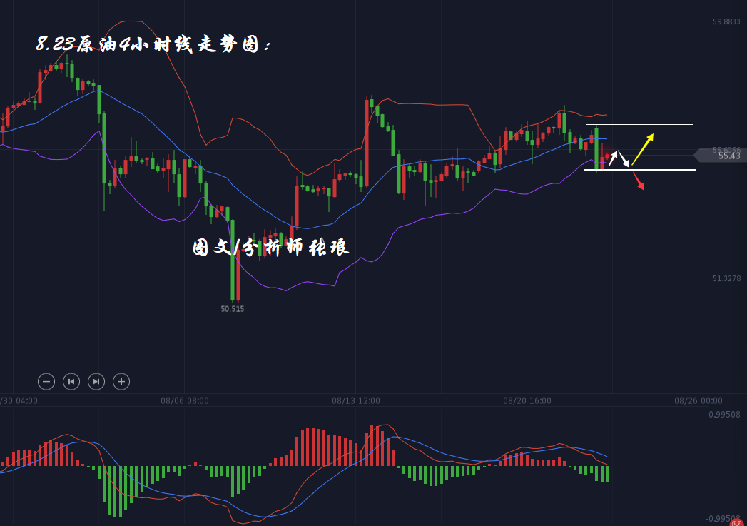 技术面4小时走势图上:布林带整体持平向上运行,油价自高位回撤之后,于下方布林带下轨受到支撑。MACD指标运行于0轴上方,死叉运行下探至0轴附近,空头能量短线增强。日内后市操作上重点关注昨日低位54.8美元支撑,若油价下破支撑,则后市有望延续走低至54.2美元下方;反之,若油价低位受到支撑,则日内后市必将反弹上攻至55.9美元压力附近。