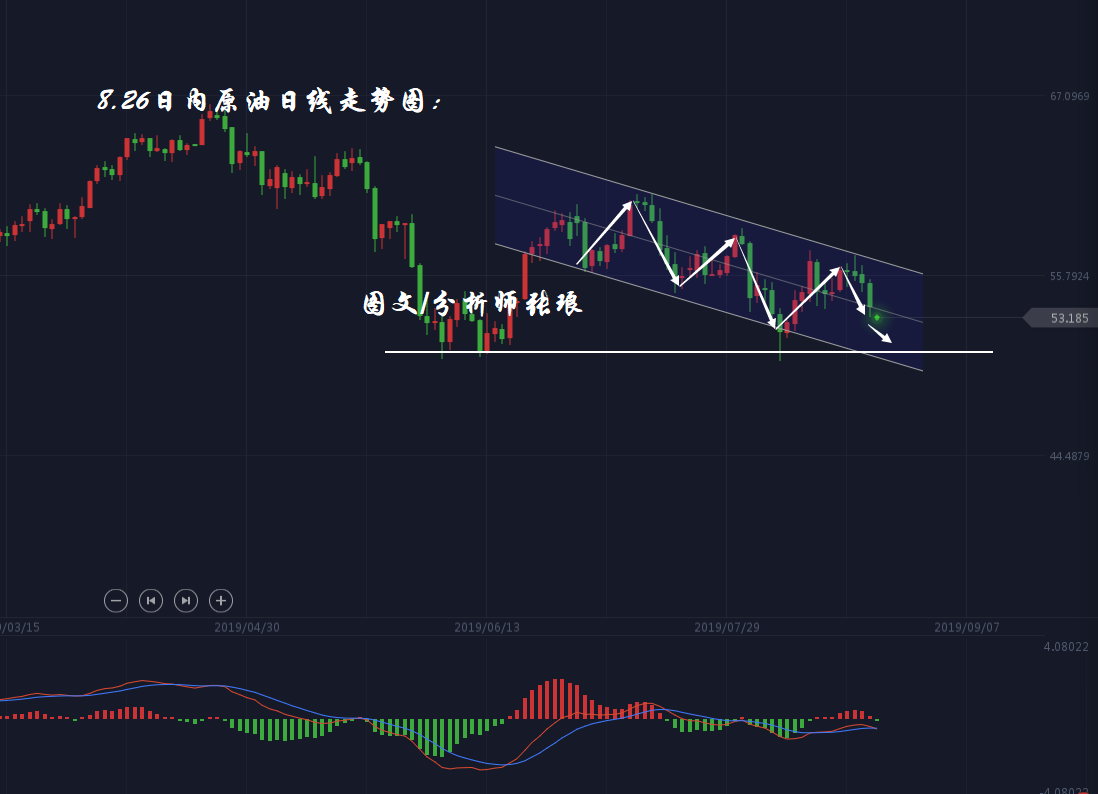 上周原油整体走弱,日线上形成四连阴走势。经贸问题这一年内以来最重要的问题又出现新的风险,以及张老师不断强调的全球经济增速放缓,导致油价进入周期性低迷,加上原油库存不断增加,导致原油市场整体出现震荡走弱的情况。
