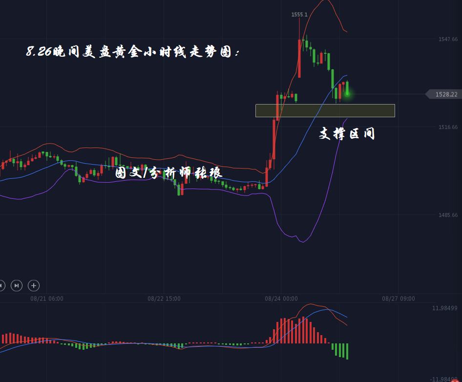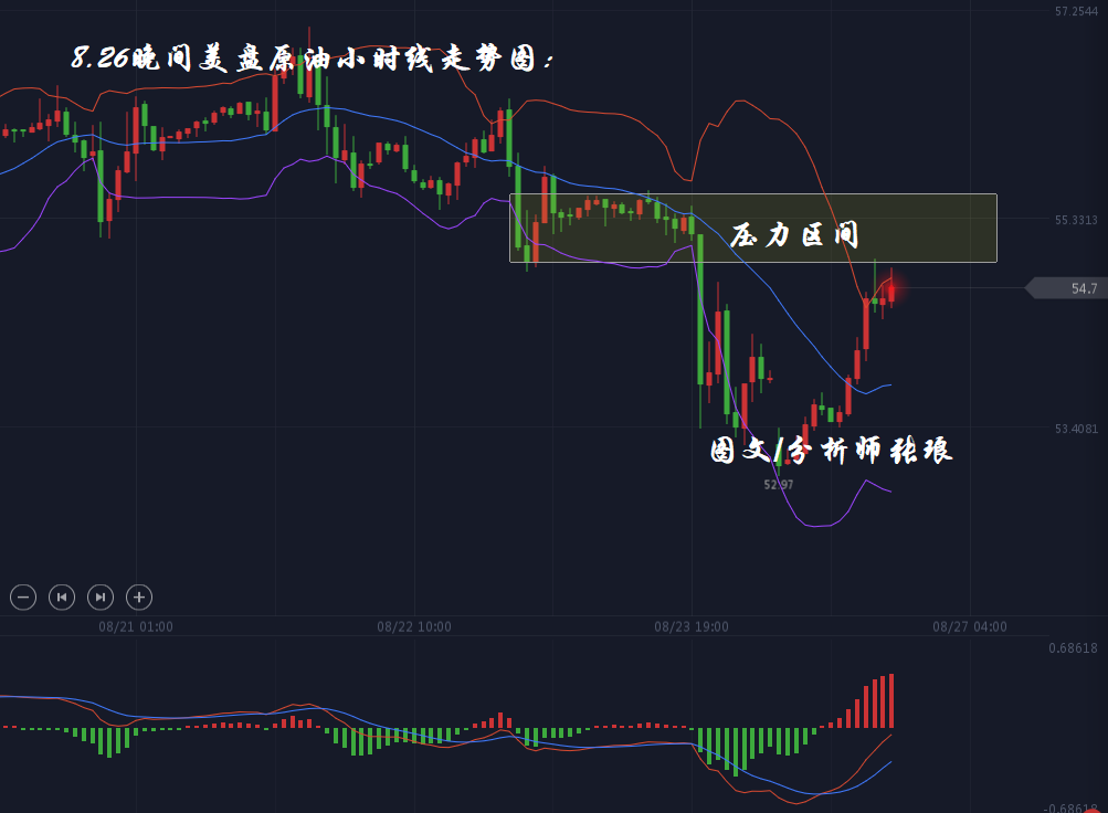 8月26日今日日内市场整体受到关税问题影响,股市走低,避险市场受到追逐。黄金早盘高开高走上探1555美元高点之后,日内回撤走弱于1537美元附近震荡之后,受市场情绪推动金价再次走低。出现技术面深度回撤,回补今日高开所留下的缺口,目前金价重新站上1530美元关口上方有望延续反弹走高。而今日原油早盘低开走弱下探52.9美元支撑之后,日内出现技术面反弹走高,成功回补上方低开所遗留下的缺口。午后油价延续反弹走高,目前油价处于54.6美元附近震荡运行。