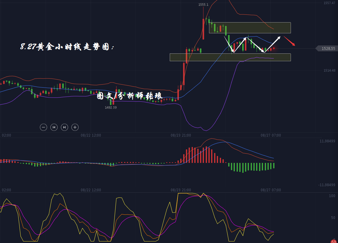 技术面小时线走势图:布林带整体出现高位向下缩口的走势,黄金整体处于布林带下轨与中轨之间小区间范围震荡运行。附图指标MACD指标运行于0轴上方,双线死叉下行,空头能量柱小幅减弱。KDJ指标三线掉头粘合上行,有进一步上移的趋势。因此日内后市黄金需重点关注下方1520—1525美元区间支撑,日内预期黄金在下探此低位支撑后将再次保持反弹上攻的走势为主,上方高点关注1538—1541美元区间压力即可。