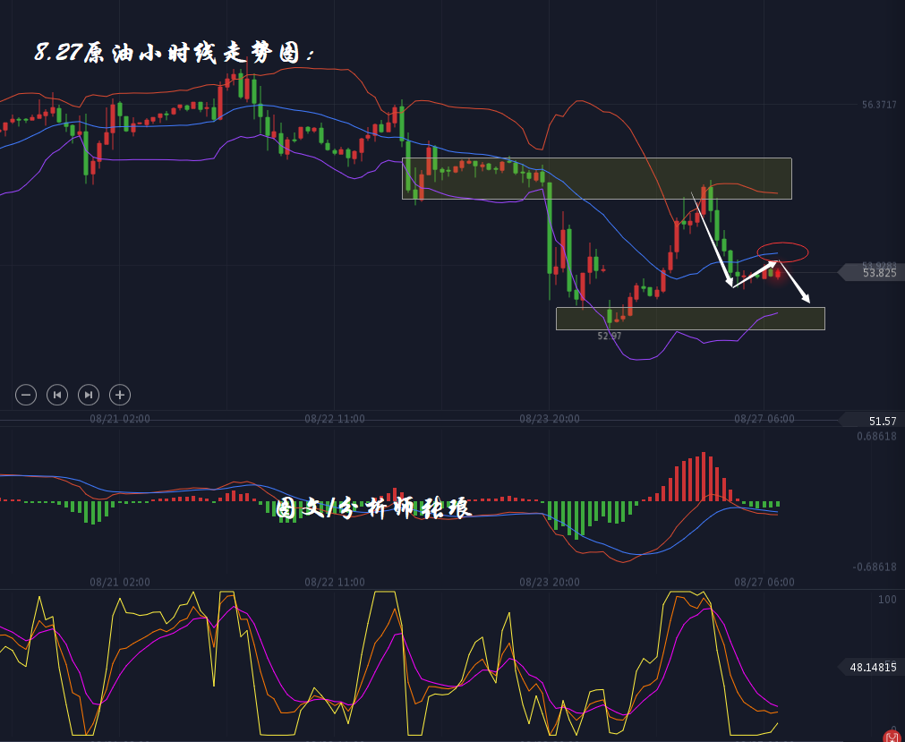 技术面小时线走势图上:布林带整体持平运行有向上缩口的趋势,油价昨日跌穿布林带中轨支撑54.0美元。附图指标MACD运行于0轴下方,再次形成死叉,空头能量柱小幅增强。KDJ指标于底部上行,有粘合趋势。日内后市来看,预期油价将上探布林带中轨54.1—54.4美元区间后,再次回撤走弱考验下方布林带下轨53.2美元支撑。