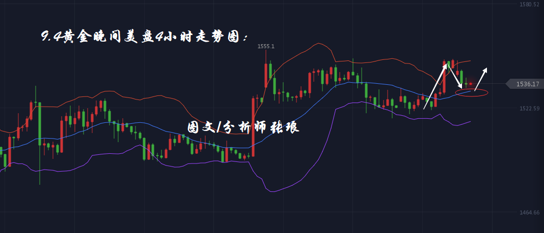 黄金今日周三(9月4日)日内整体震荡走低,盘中最低下探至1533.5美元/盎司附近后反弹走高。技术面4小时走势图,布林带整体持平运行,金价日内自布林带上轨压力附近震荡回撤走弱。值得注意的是,今日日内美元同样出现单边走弱,盘中跌穿99关口支撑。因此预期晚间美盘黄金整体仍将保持多头趋势,下方关注1530—1531美元/盎司支撑区间反弹上攻走强,晚间美盘金价有望回吐日内跌幅走高。