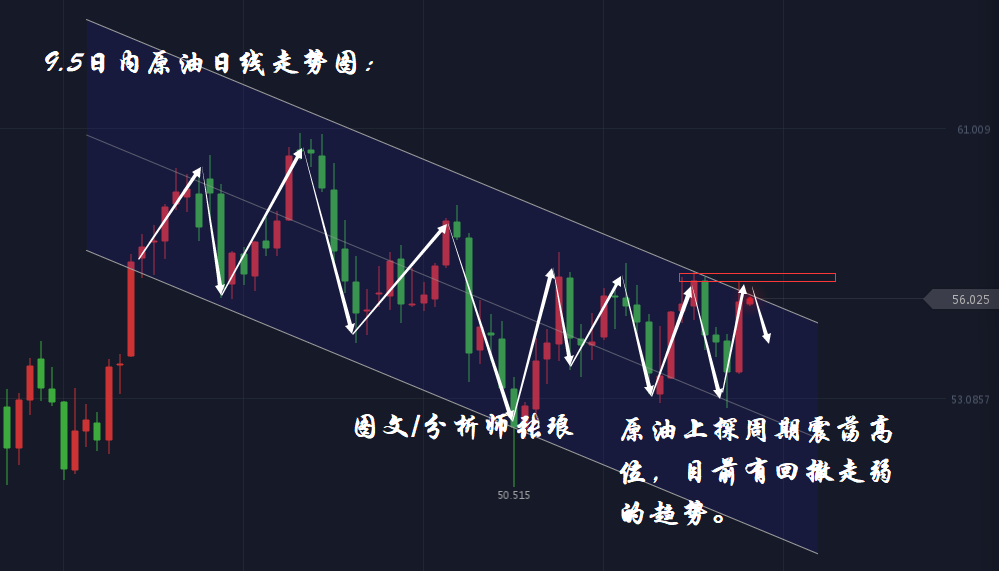 原油昨日受市场消息面影响稳步走高,盘中最高上探至56.5美元/桶高位。技术面日线走势图,油价整体仍处于下行走弱的通道之中,值得注意的是目前油价已上探至通道区间上轨压力附近。虽然昨日短线上原油受到消息面提振的影响,但是今日市场重点在等待晚间EIA数据的公布,结合API及前期数据来看,张老师预期今日EIA数据将再次录得增加,进而利空油价的作用。原油日内有望技术面震荡上攻至56.4—56.4美元/桶压力区间之后,整体回撤走弱下探至55.3,乃至54.3美元附近。