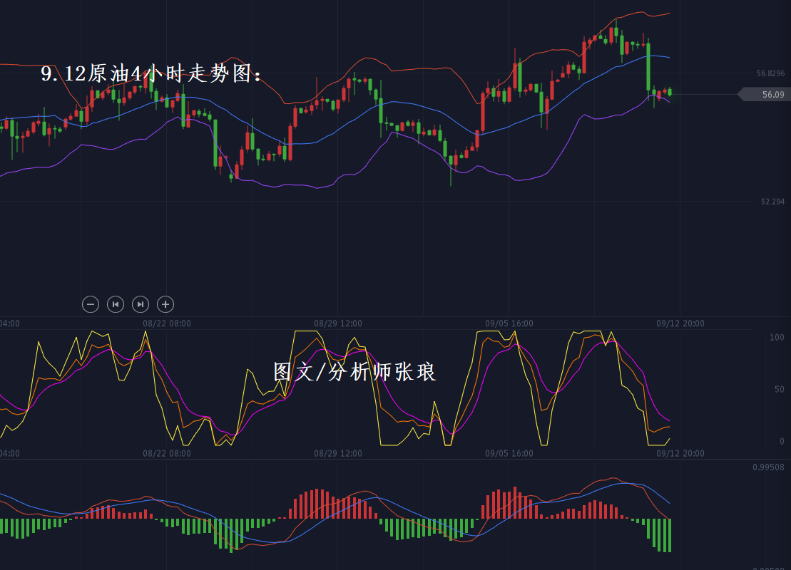 目前技术面原油4小时线走势图,在经历昨日单边下跌之后,今日早盘原油整体反弹至56美元/桶附近震荡运行。目前布林带整体有开口向下延续走弱的趋势,油价持续对布林带下轨施压。KDJ指标目前处于超卖区震荡调整,MACD指标大幅死叉下行,有下穿0轴的趋势空头能量柱显著增加。考虑到目前市场释放出放松对伊朗制裁的消息,短线上原油面临着承压的趋势。因此日内后市操作上重点关注上方56.4—56.7美元/桶压力区间进空策略,下方重点关注56.2—56.6美元/桶支撑区间可视为多单机会。
