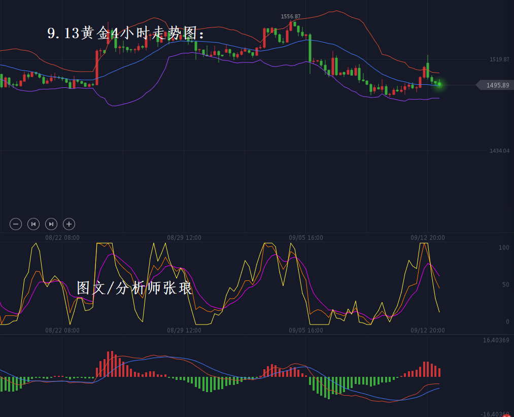 今日黄金4小时线走势图上,布林带整体再次走出持平运行走势,金价在昨日上破布林带通道区间之后,昨日迅速回撤至布林带通道之内运行。KDJ指标大幅回撤向下;MACD指标运行于0轴下方,快慢线形成金叉有所减缓,多头能量柱所有减弱。因此日内盘中金价关注重点关注布林带下轨1489—1492美元/盎司支撑区间保持多单策略即可。