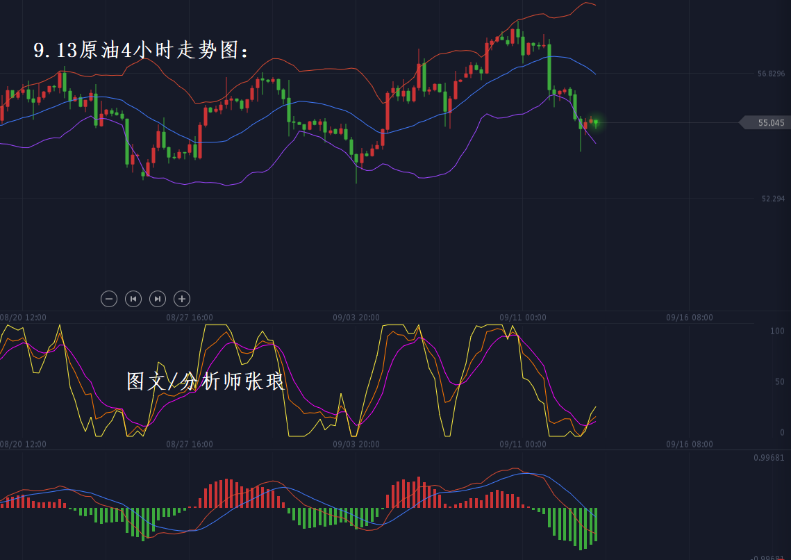 目前技术面原油4小时线走势图,今日原油整体下行走弱,布林带整体大幅开口下行,目前油价有调整之后再次下行的趋势。KDJ指标目前于底部有所反弹上升,MACD指标大幅死叉下穿0轴空头能量柱有所减小。因此日内后市操作上重点关注上方55.2—55.6美元/桶压力区间进空策略,多单策略需根据实际情况实时给出。