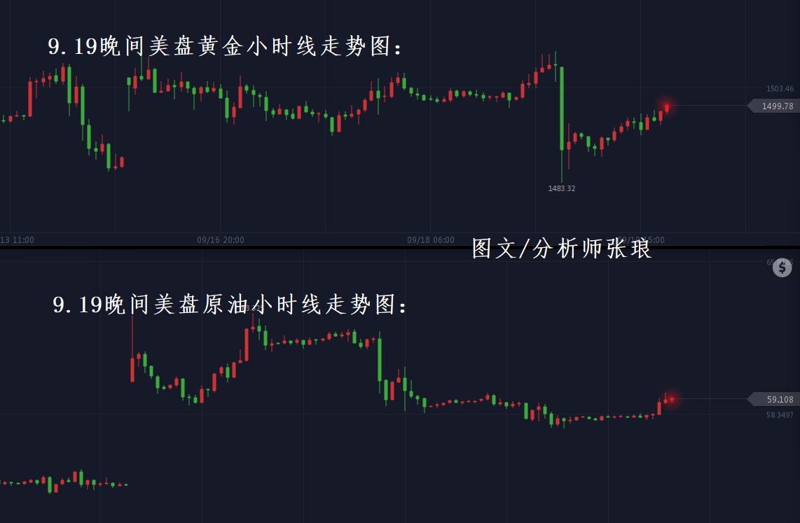 今日周四(9月19日)日内受全球经济2019年增速再次下调影响,金价依托1490美元/盎司成功反弹上攻高走,盘中最高上探至1499美元/盎司后小幅回调。日内原油整体维持于58美元/桶附近震荡运行,午后欧盘时段原油突然发力反弹上攻至59.3美元/桶附近。