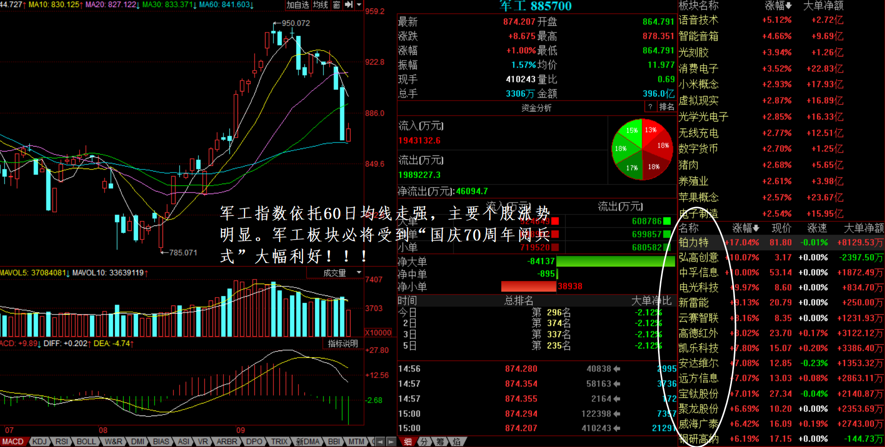 虽然前期受到经贸问题的影响,军工板块整体走低。目前指数已下探至60日均线支撑后反弹,且优质个股涨势明显。吓走有望受到国庆阅兵式的利好国庆首周整体走高。且股市整体来看,国庆首周股市上涨概率达到90%以上,因此这也是“银十月”的俗语所在。