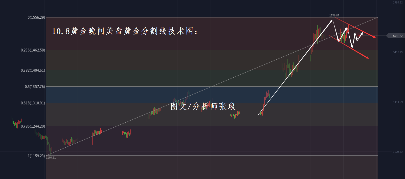今日10月8日(周二)黄金日内盘中与张老师盘中预期一致,金价早间下探至1488美元/盎司下方之后,顺势反弹上攻盘中最高上探至1504美元/盎司上方,目前整体重回千五整数关口上方运行。而原油则午后重回53美元/桶上方之后,盘中最高触及53.3美元/桶附近后,晚间初始油价如预期之中单边暴跌,盘中最低下探至52美元/桶附近。黄金急行多头,原油不改空头,日内不论是黄金,还是原油整体走势都在张老师预期之中,感兴趣的朋友可查阅张琅老师日内早盘文章阅读了解。