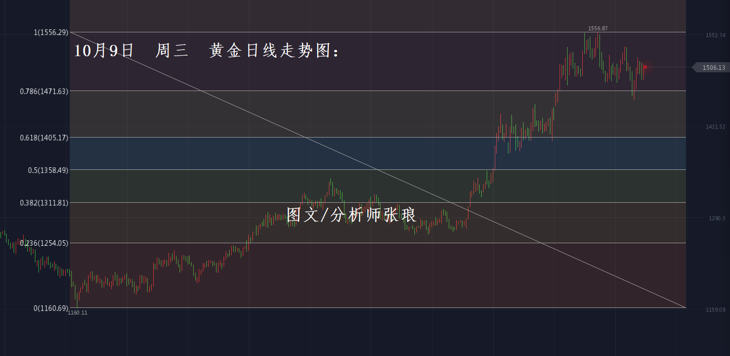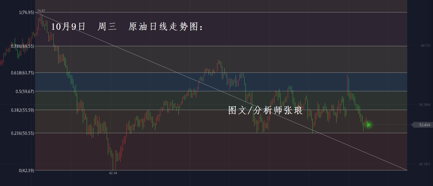昨日周二(10月8日)全日盘中,黄金成功上破1500美元/盎司上方震荡走高,盘中最高上探至1509美元/盎司;原油昨日延续空头走弱,晚间盘中曾一度下破52美元整数关口支撑,下探至51.8美元/桶,随后油价回吐部分跌幅,反弹至52美元上方震荡运行。昨日黄金走高、原油走空,张老师昨日盘中多次为大家指出“趋势”,想必大家又是满载而归,感兴趣的朋友可查阅张琅老师昨日盘中文章阅读了解。