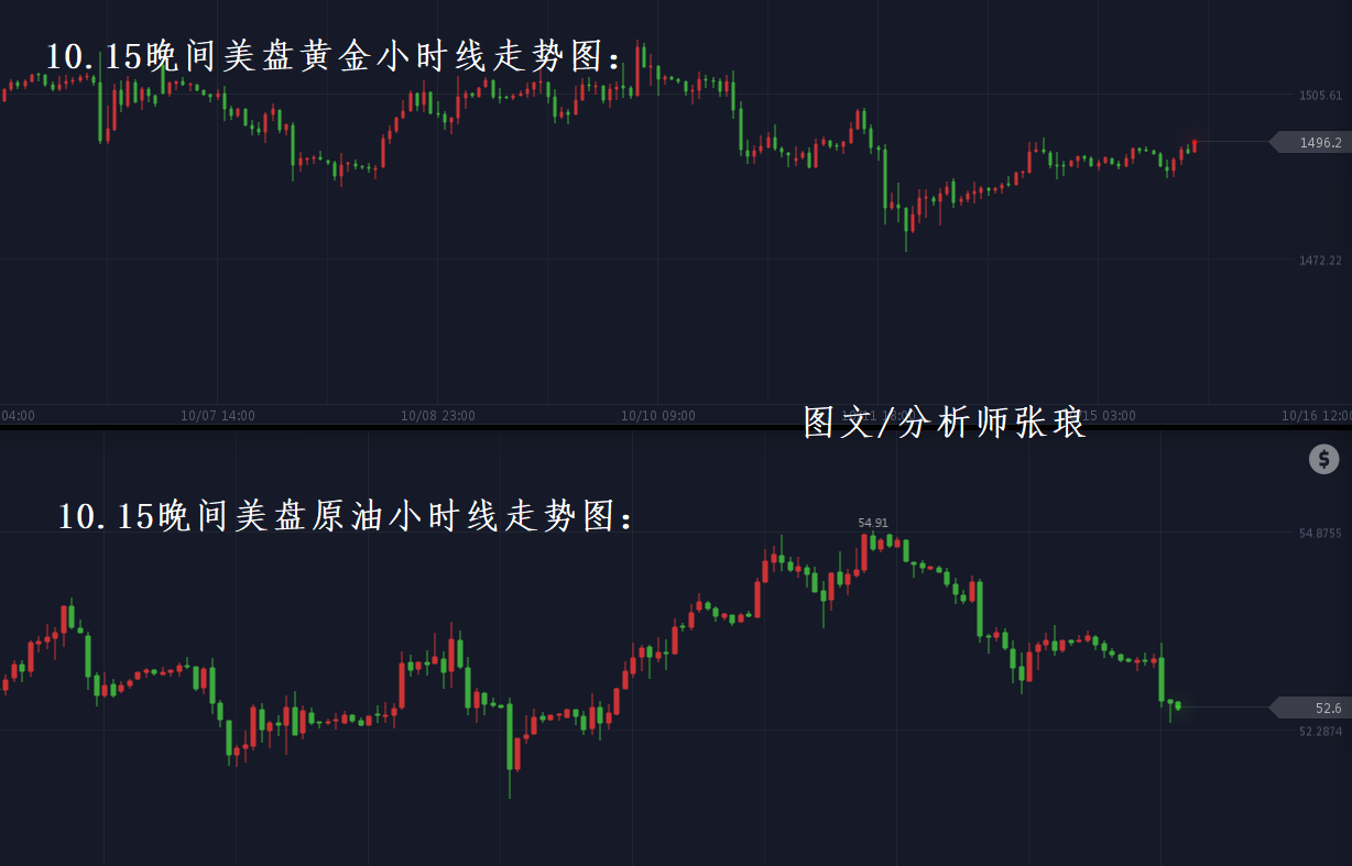 今日10月15日周二,“黄金走多,原油走空”整体趋势仍在延续。午后欧盘时段黄金回撤成功下探至1488美元支撑后,反弹上攻走高,至目前盘中最高上探至1496美元附近,早间笔者给出黄金低位多单成功收割离场。原油日内整体于53美元上方震荡运行,午后欧盘反弹至53.4美元附近后,整体再次出现暴跌走弱,至目前,盘中最低下探至52.4美元附近,早间笔者给出的空单策略再次成功预测了行情的走势。