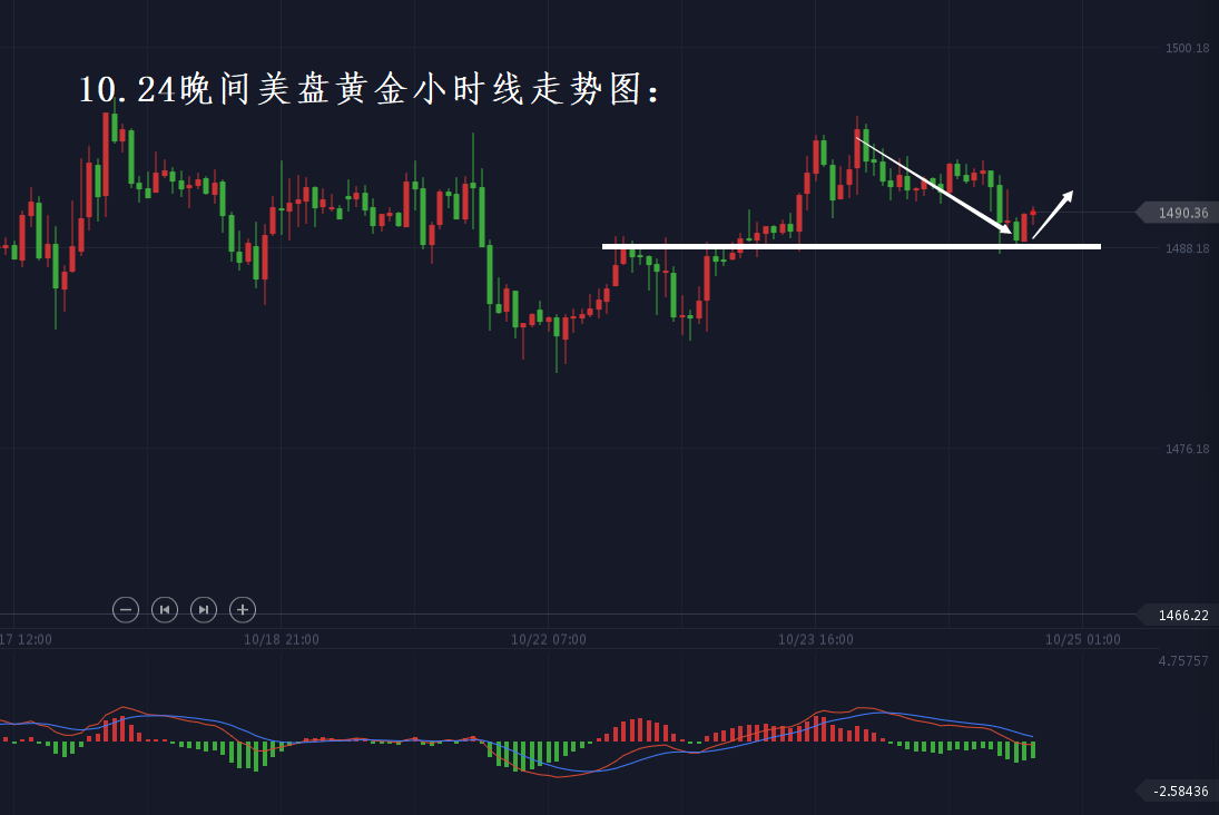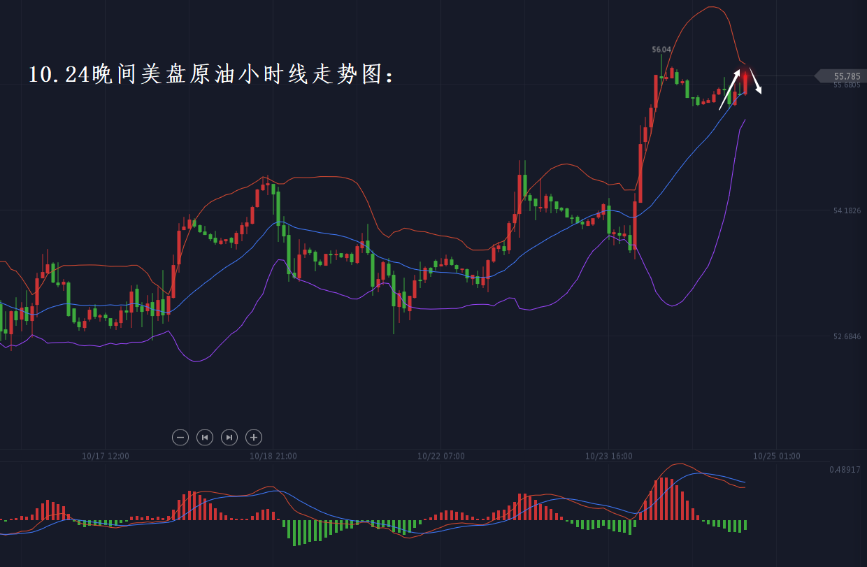 今日10月24日周四,黄金、原油如预期中震荡运行。其中黄金日内回撤走弱下探至1487美元后,再次反弹上攻走高重回1490美元关口。原油日内如预期中回撤下探至小时线布林带中轨支撑后,受到支撑反弹走高。整体而言,黄金、原油似乎同步进入窄幅区间震荡之中。