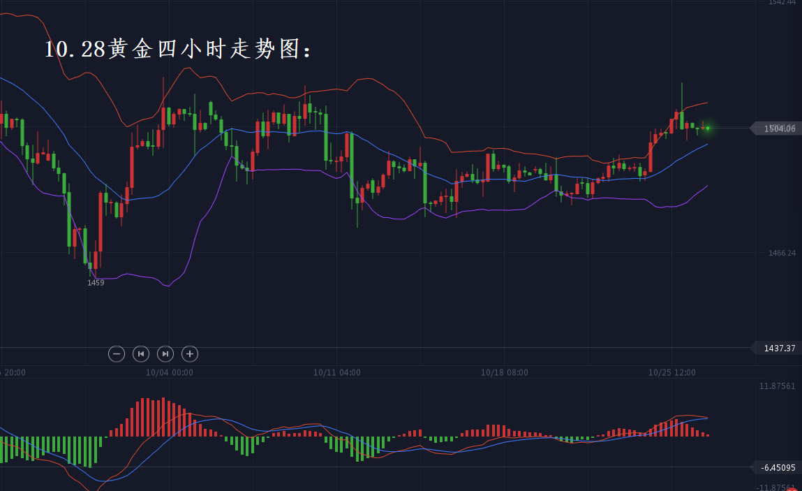 大家好!今天10月28日周一,又是新一周开始。在上周我们连续获利之后,周末想必大家已经好好休息了。本周我们再次重新出发,力争扩大战果。上周行情较为简单,黄金回踩至1480美元支撑后便一路反弹走高,成功站上1500美元上方,盘中最高触及1517美元附近,单周最大涨幅达到近40个点。原油上周在EIA原油库存数据意外减少的情况下,油价稳步走高,至低位52.7美元,最高反弹上攻至56.5美元,单周涨幅同样达到40余点。