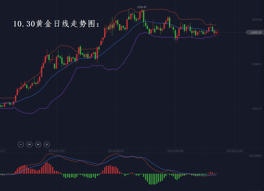昨日市场风险较为平淡,英国再次延迟脱欧、经贸局势风险偏好,导致黄金昨日有所回撤,在市场卖盘的情绪影响之下,金价回撤走弱一度下探至1484美元附近,随后再次反弹重回1490美元附近震荡。而油价在沙特准备进一步减少石油产量的计划下,预期将于11月3日开始沙特阿美公司IPO进程,并于11月17日宣布IPO价格范围。原油在昨日下探至54.5美元后,晚间美盘反弹回吐跌幅上探至55.8美元附近。整体而言,黄金、原油在昨日日内同步走弱之后,晚间美盘均保持不同程度的反弹走高,与张老师昨日晚间美盘预期一致,感兴趣的朋友可查阅张老师昨日晚间美盘文章阅读了解。