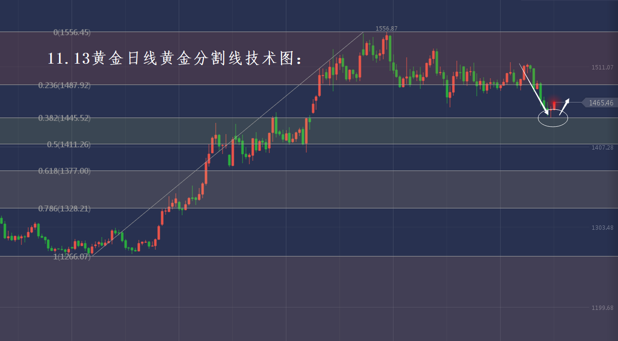 黄金日线黄金分割线来看,金价在昨日下探至黄金分割线0.382(1445美元)后顺利反弹上攻走高,张老师昨日晚间美盘曾重点提醒大家关注黄金分割线0.382的破位情况。目前正如我们所料,金价在0.382支撑位成功出现触底反弹的迹象,今日日内金价的反弹也再次证明这一点。针对于今日晚间美盘,我们有理由相信金价会延续多头走势,有望上探至1470美元上方,金价今日相信会收盘于1460美元上方,若是如此则金价明日将再次出现大幅反弹走势。因此晚间美盘大家重点关注1460美元支撑,保持逢低进多为主。