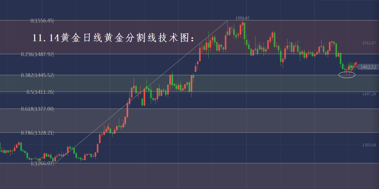 黄金日线黄金分割线来看,金价目前正依托黄金分割线0.382(1445美元)出现筑底反弹的情况。正如昨日张老师所言“若金价能顺利收盘站稳1460美元支撑,则后市金价有望延续反弹上攻走高”。因此今日盘中策略仍保持逢低看多为主,下方重点关注1460美元关口支撑,伺机选择多单机会。