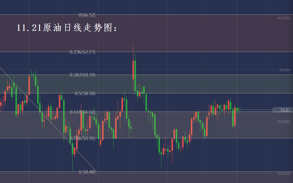 原油日线黄金分割线技术图,昨日油价反弹拉伸再次回到技术线0.618(56.6美元)关口上方。今日早间开盘金价便再次回撤走弱,有下探0.618(56.6美元)的趋势,可以预见的是油价即便今日下破支撑,最多将在55.7美元附近企稳。因此日内操作上线保持看空为主,待油价下探至低位支撑则逢低进多。操作上重点关注57美元压力,采取逢高进空策略为主。