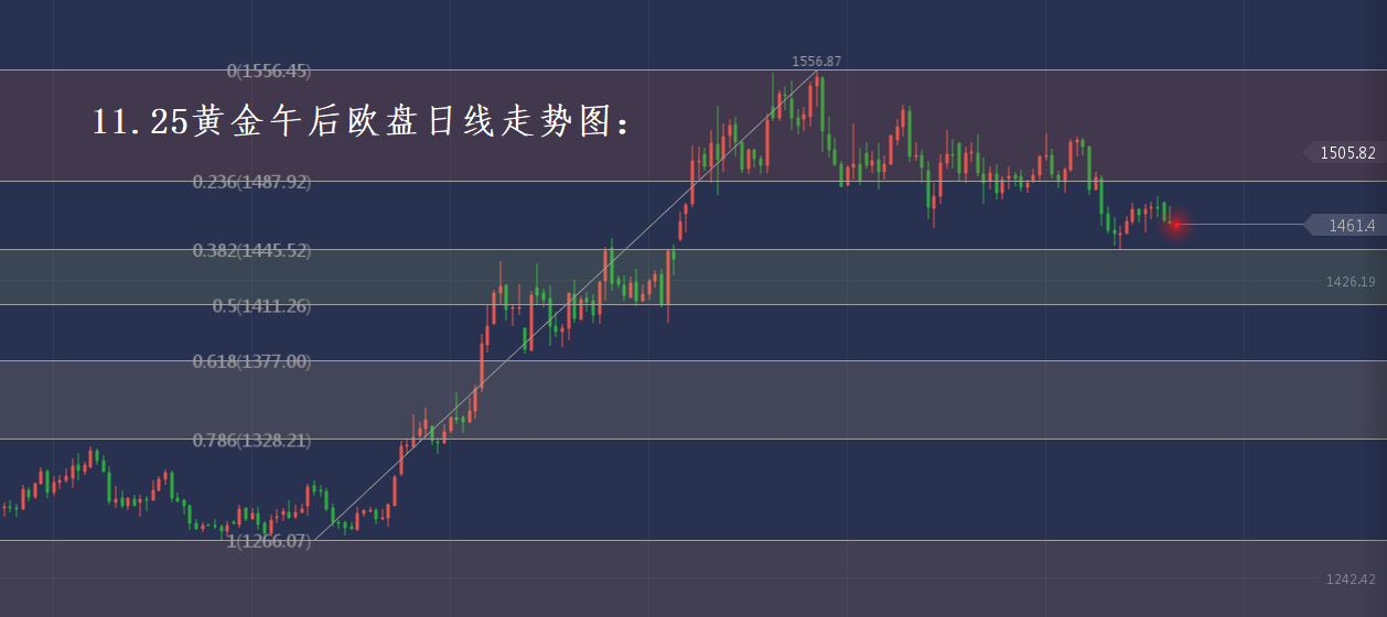 黄金日线黄金分割线技术图,早盘金价整体横盘震荡运行,上周日线“三连阴”与“倒锤线”已经给我们指出了金价空头方向,整体而言金价预期后市将下探技术线0.382(1445美元)支撑。因此午后欧盘操作上依然延续早盘策略重点关注上方1463美元压力,保持进空策略为主。
