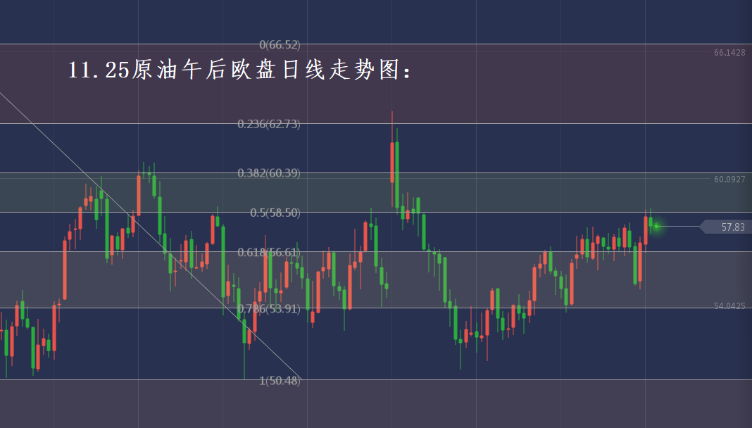 原油日线黄金分割线技术图,今日早盘油价整体震荡走弱,在上周技术线0.5(58.5美元)高位附近形成“双针探顶”走势,目前油价下行趋势已经尤为明显,后市油价有望下探至技术线0.618(56.6美元)低位。因此日内操作仍保持早盘策略为主重点关注上方58.2美元压力,保持空单策略为主。
