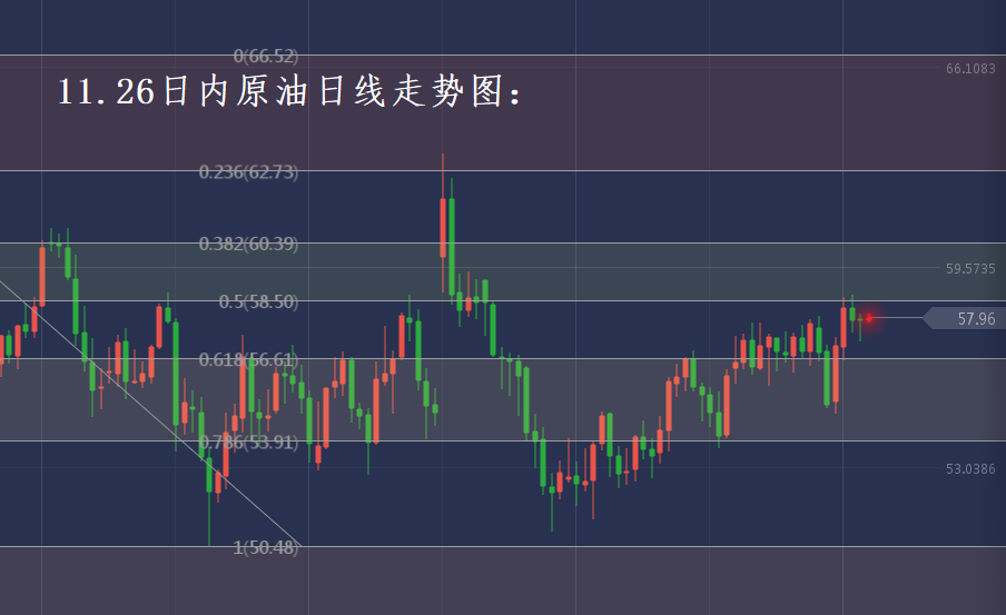 原油日线黄金分割线技术图,昨日油价探底反弹,收取日线十字星。目前油价暂时出现企稳的迹象,但是整体而言空头仍是目前主要的趋势。但是不排除油价再次反弹上攻至技术线0.5(58.5美元)压力后,再次回撤走弱。因此日内操作仍保持昨日策略为主重点关注上方58.2美元压力,保持空单策略为主。