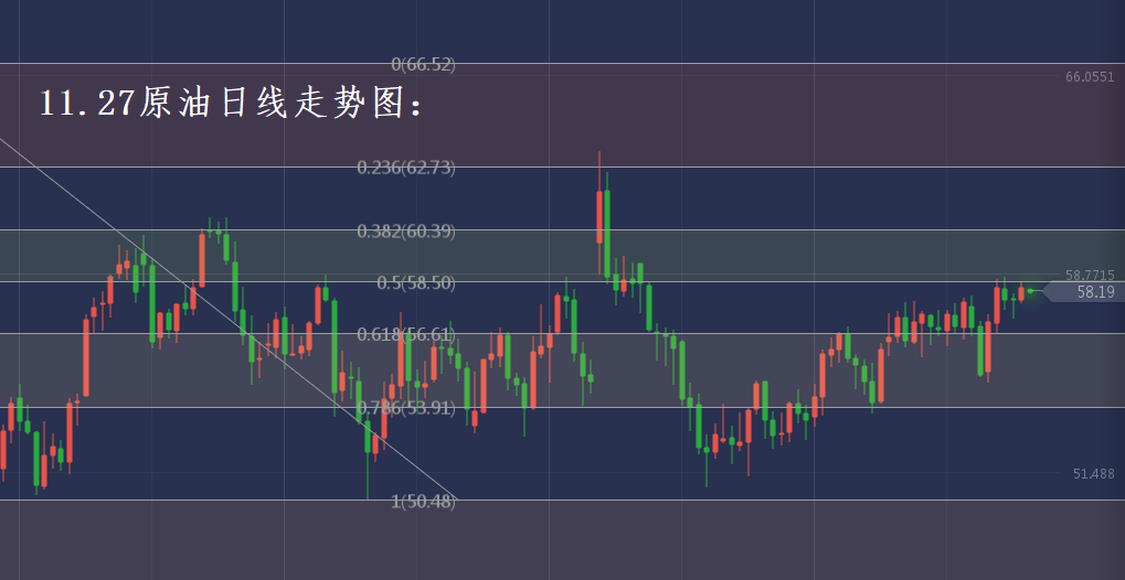 原油日线黄金分割线技术图,昨日油价反弹上攻走高如预期一致成功上探至技术线0.5(58.5美元)附近。目前有消息表示欧佩克将延长减产协议3—6个月,加上今日EIA原油库存数据,油价整体保持高位承压的态势。因此日内操作重点关注58.5美元压力,保持空单策略为主。