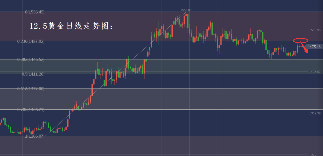黄金日线黄金分割线技术图,金价昨日盘中一度走高刷新月内高位,上方靠近技术线0.236(1487美元)附近,今日早间开盘金价平开震荡,整体维持于1475美元附近。预期今日日内金价整体将出现横盘震荡调整走势,金价有望反弹上探至1483美元压力后,再次出现回撤走弱的趋势。因此日内操作上关注下方1472美元附近支撑,选择布局多单思路;上方若成功上探1483美元,则可选择空单思路。