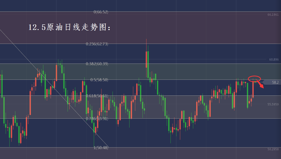 原油日线黄金分割线技术图,油价昨日于技术线0.618(56.6美元)成功破位上攻走强,单边上涨探至技术线0.5(58.5美元)高位压力附近。日内油价处于58.5美元高位附近,整体可以明显看到油价受制于上方压力,后市整体承压。因此日内操作上重点关注技术线0.5(58.5美元)压力附近,选择空单为主策略。