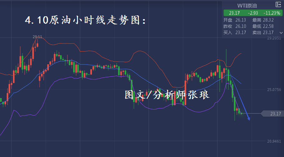 原油先拉升后回撤,整体上与张老师预期一致,且成功刷新周内新低。今日早间开盘油价于23美元/桶附近震荡运行。由于今日欧佩克+还将举行新一轮的谈判,目前来看市场似乎出现减产的迹象。但是在新的决议出现之前,任何情况都有可能,大家不可妄自揣测。目前小时线布林带走势图上,布林带整体开口下行,油价持续对布林带下轨施压,因此在欧佩克+会议结果确切之前,操作上大家仍需保持逢高进空策略为主。