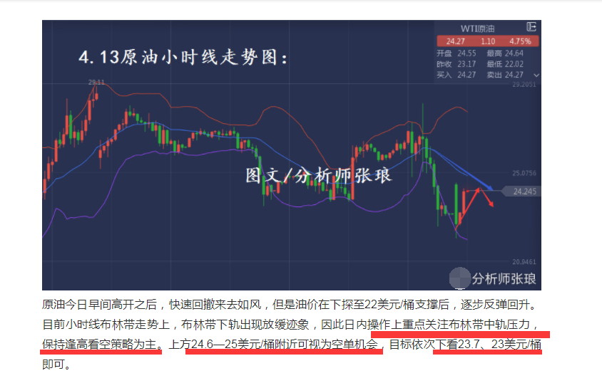 昨日盘中针对原油走势,分析师张琅果断给出“依托布林带中轨,选择逢高进空”策略。于早间成功于24.4美元/桶空单进场,油价连续突破两大预期点位23.7、23美元/桶支撑,待油价下行至22.6美元/桶时,迅速通知大家离场。成功抓取18个点。
