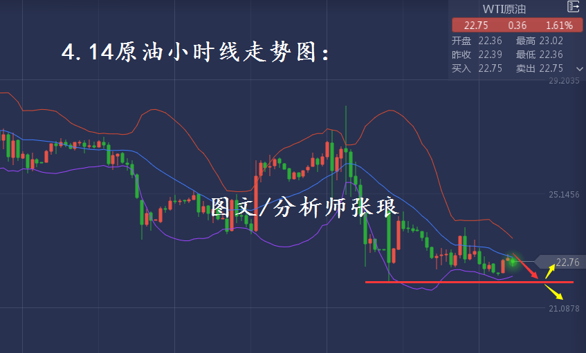 在三度推迟之后,沙特公布了原油出口定价:下调5月份面向亚洲的原油定价,全面上调美国的原油定价。沙特放弃扩大在美国的市场份额,这对于正处于水深火热的页岩油企业来说无疑是个好消息。目前小时线布林带整体保持向下缩口的趋势,整体而言油价有再次下探前期低点22美元/桶的趋势。因此日内操作上重点关注布林带中轨压力,保持逢高看空策略为主。上方关注23美元/桶附近可视为空单机会,下方关注22美元/桶支撑。若油价下破22美元/桶,则顺势追空即可,反之选择多单过渡即可。
