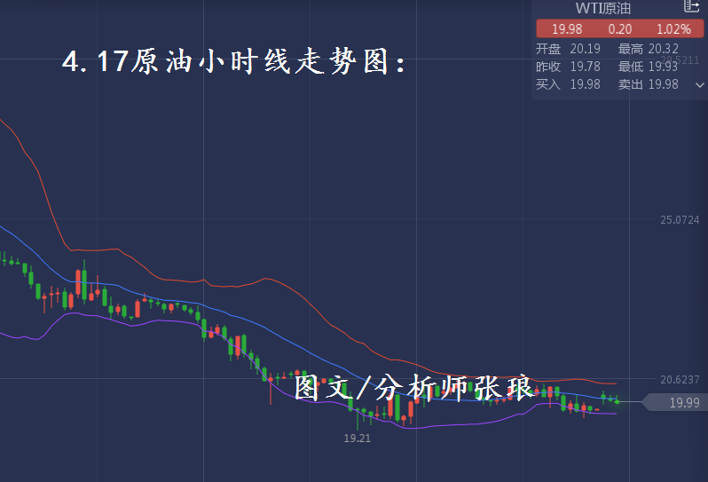 沙特与俄罗斯均承诺遵守减产协议,美国康菲石油公司将削减四分之一以上的产能,主要原因在于目前已经没有地方可储存新开采的原油。原油小时线布林带整体持平运行,今日早盘油价小幅高开,随后震荡走弱。目前油价有再次走低下探前期低位19.2美元/桶的趋势,因此日内操作上大家仍需关注空头策略为主。上方关注布林带上轨20.3—20.7美元/桶压力可视为空头机会。