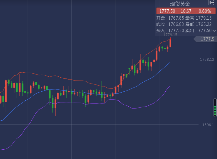 黄金4小时技术面,今日黄金依托1770美元支撑附近,整体保持上攻1780美元的趋势。目前不排除金价再次回撤至1770美元的趋势,但是就目前行情走势来看,我们有理由相信金价将上破1780美元,再次创下新高。