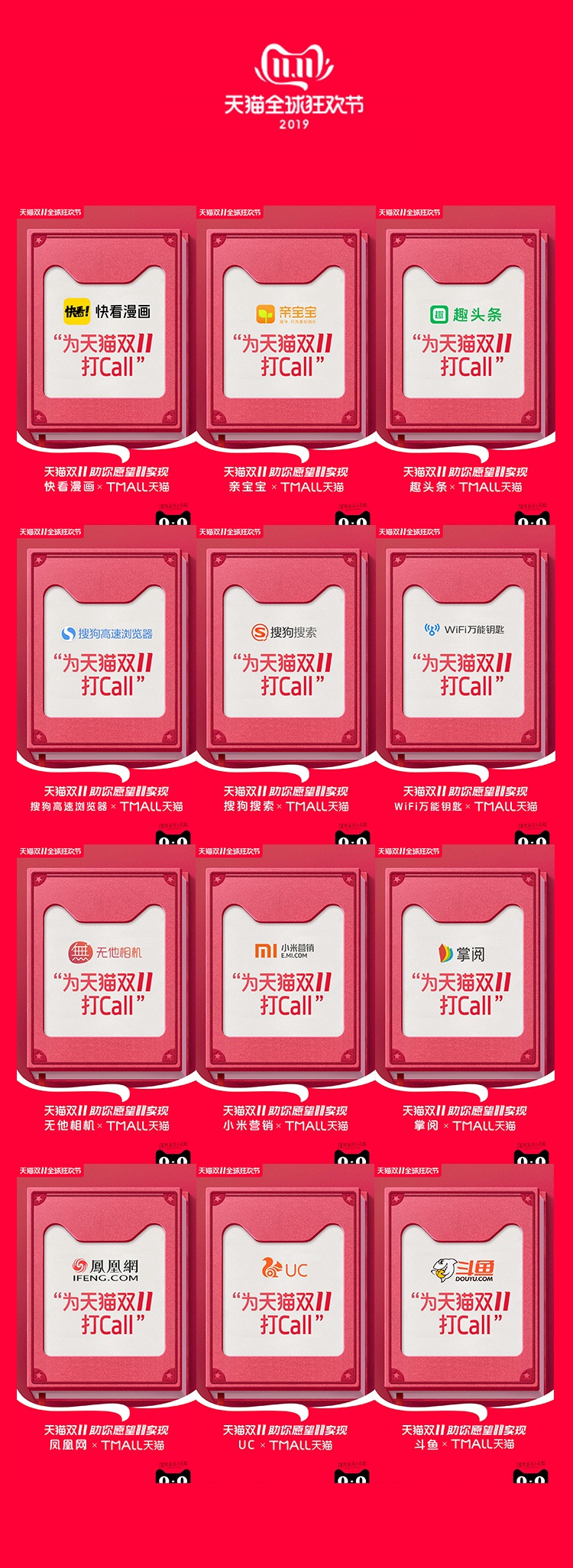 据悉,它们中既有阿里巴巴经济体内的支付宝、饿了么、飞猪、高德、淘宝、优酷、盒马等,也包含百度、巨量引擎、快手、网易云音乐、360搜索、喜马拉雅、酷狗音乐等明星公司,通过与天猫的联动,方便消费者参与到2019年天猫双11的精彩内容和玩法中去。