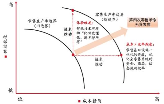 刘强东举了百货商店、连锁商店、超级市场这三次零售革命的例子,认为虽然每一次变革都堪称革命,但是其“成本、效率和体验”的内核没有变。例如,在超级市场时代,“开架销售、自我服务的模式,创造了一种全新体验”,而“如收银系统、订货系统、核算系统等现代化IT系统的使用则提高了商品的流通速度和周转效率”。