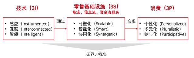 刘强东的“第四次零售革命”则不同,在阐述上更加系统、深入,提出了“3I+3P=3S”的理念。具体来说,刘强东认为第四次零售革命的驱动力有两个,一个是技术,一个是消费。在技术上,物联网、智能化等技术的变革将呈现出“3I”的趋势:感知(Instrumented),对场景的感知能力越来越强,而且场景能够数据化;互联(Interconnected),打通不同场景的数据,而且可以最大程度实现数据共享;智能(Intelligent),智能化水平不断提升,销售预测更精准,库存计划更符合需求等。