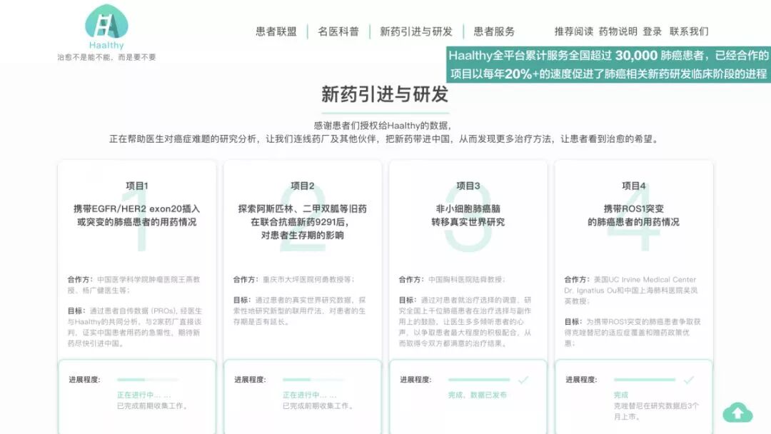 肿瘤大数据平台 Haalthy 全平台累计服务全国超过 3 万名肺癌患者,已经合作的项目以每年 20%+ 的速度促进了肺癌相关新药研发临床阶段的进程。