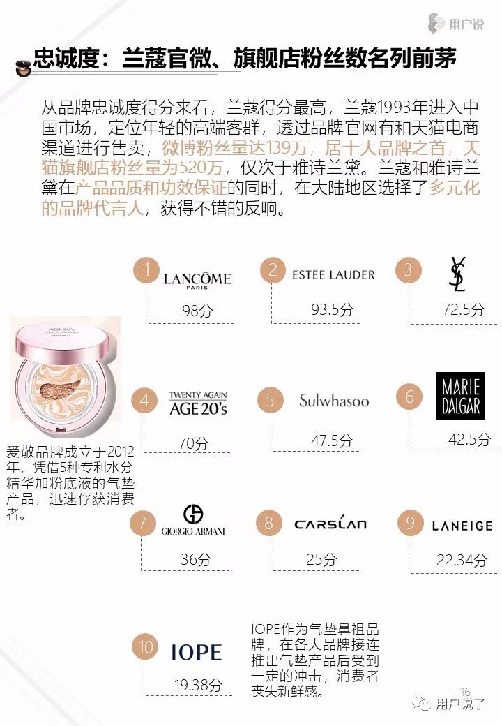 用户说: 根据品牌实力图,雅诗兰黛、YSL、兰蔻这三个依靠过去沉淀的品牌价值和用户基础,表现最为强势,而气垫创始品牌IOPE目前整体实力偏低,不过韩系的后起之秀爱敬表现也可圈可点,而国产品牌玛丽黛佳成为中国的品牌担当。