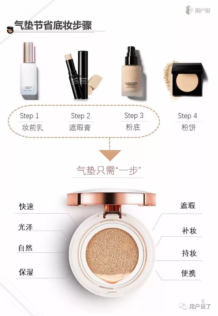 用户说: 随着科技发展、消费者需求是在不断变化的,除气垫粉底外,有些品牌已经推出了各种气垫彩妆,如腮红、隔离、眉粉等,消费者化妆更加轻松便捷,进一步释放消费潜力。